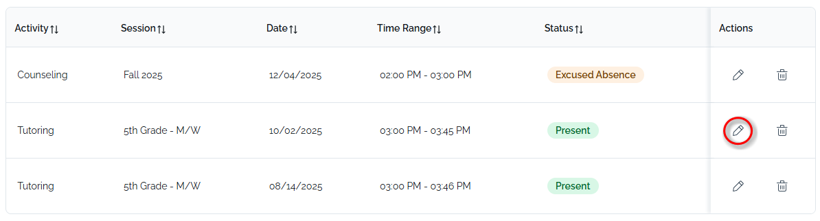 To edit a participation record, click the pencil icon next to the record you would like to edit.