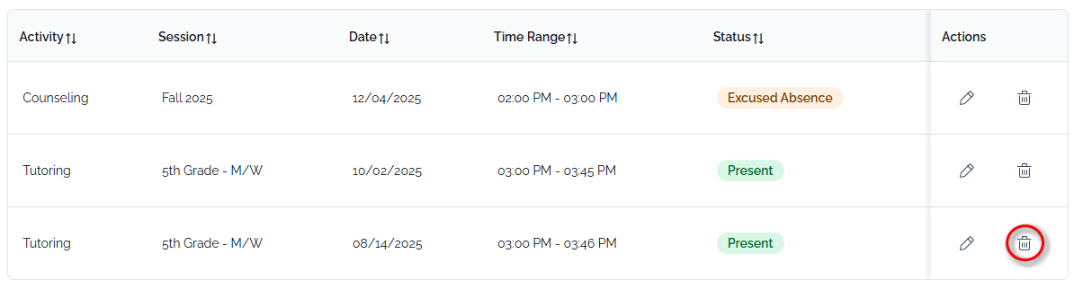 On the form that appears, enter data for the Activity, Session, Date (type or use the calendar), Status (e.g., Present, Absent), Start Time, End Time, and optional Notes.
