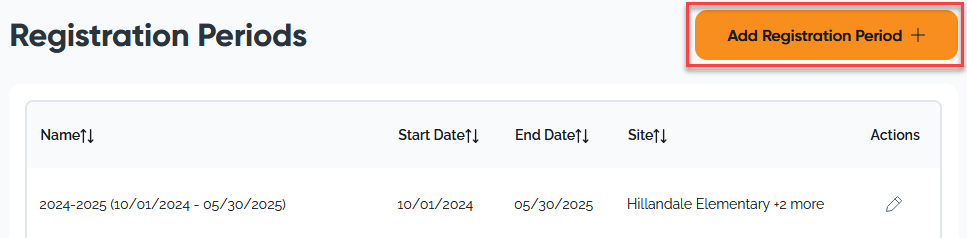 To edit a Registration Period, click the pencil icon. You can change the period's dates, organizations, or enrolled programs, and then click Next Step and Save Registration Period to save your updates.