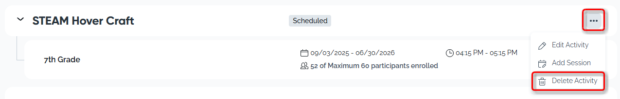 If participation was recorded for any sessions of the activity, you may receive an error message; such activities cannot be deleted.