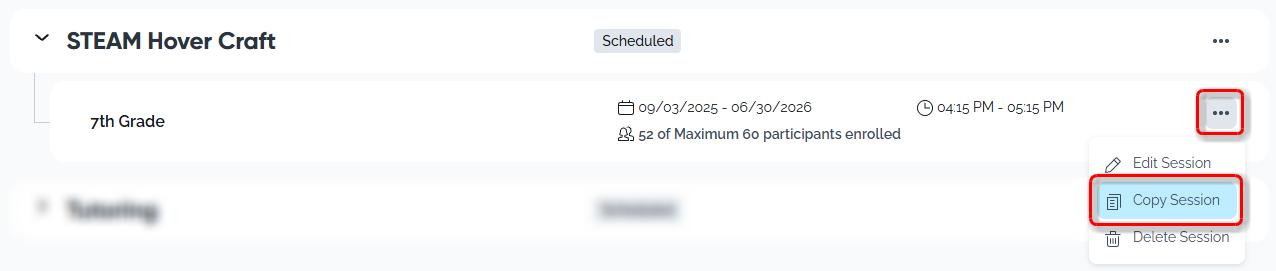 Next to the session you wish to copy, click the ellipsis. Then, select Copy Session from the dropdown menu.