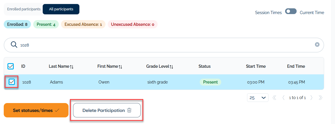 After selecting the correct date of participation and clicking Next Step, the Select Participants screen will appear.