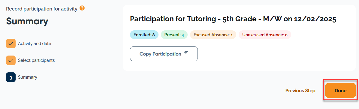 Clicking Next Step will bring you to the Step 3 Summary screen. Here a summary of the activity/session date and participation counts by status will be displayed. If all looks accurate, click the Done button to return to the main Participation screen.
