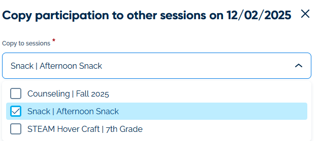 First, in the Copy to sessions drop-down, check which Sessions you would like to copy this just-recorded participation to. In this example, we will plan to copy "Tutoring" participation to "Snack | Afternoon Snack."