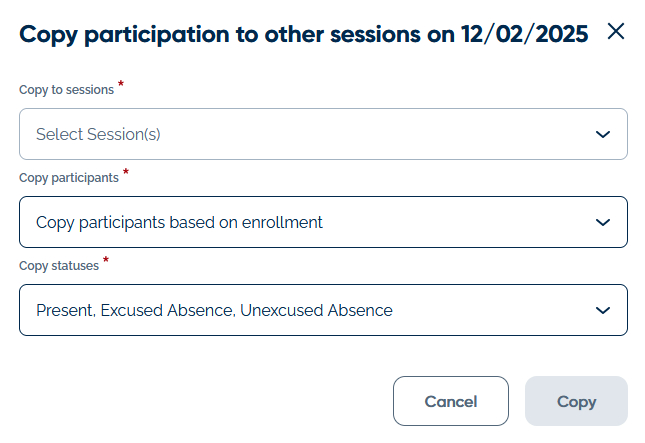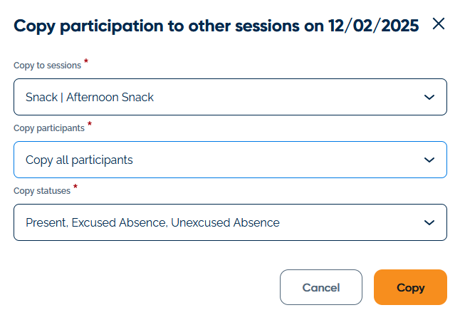 - The Copy Participation feature saves time for programs with scheduled sessions and enrolled students. By marking attendance for one session (e.g., Snack), you can copy participation to all other sessions for which the students are enrolled on that day. Selecting "Copy participants based on enrollment" marks students present in the initial session as present in all their other sessions for that date. If a participant leaves early, you can remove their participation from specific sessions by editing those attendance lists directly.