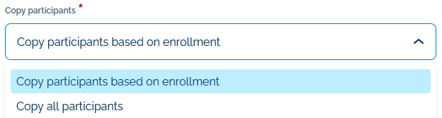 Next, if you want to have only participation copied for those that are enrolled in the Afternoon Snack session, select Copy Participants based on enrollment from the Copy participants drop down list options. If you want to copy participation for all those with participation recorded for Tutoring, regardless of whether or not they are enrolled in the Afternoon Snack session, select Copy all participants.