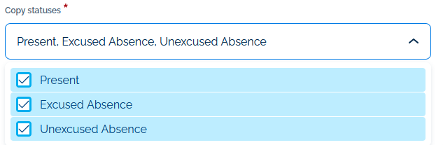 Finally, you can determine which participants will have participation copied based on their participation status in the Tutoring session. Check the participation statuses you would like to copy in the Copy statuses drop down.